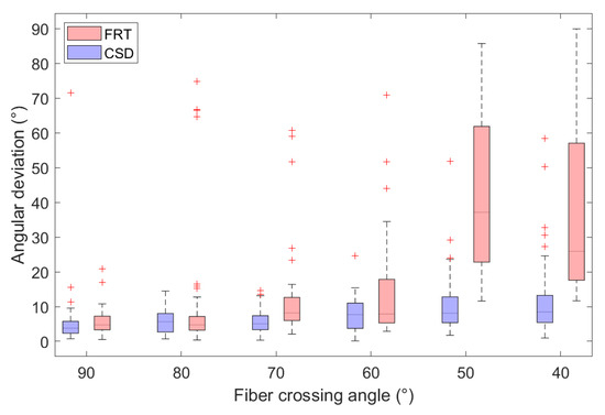 Comparison of the angular deviation between the estimated and true fiber orientations, retrieved through a FRT and CSD for various crossing angles. Outliers in the boxplots are indicated by ‘+’.