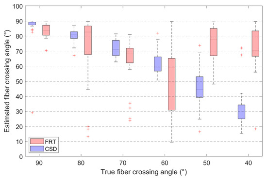 Comparison between the estimated fiber crossing angles retrieved through the FRT and CSD, for various crossing angles. Outliers in the boxplots are indicated by ‘+’.