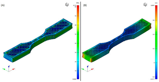 Numerical results of the DigimatAM simulation from run 13 of PA6 material: (A) residual stress, (B) warpage deformation.