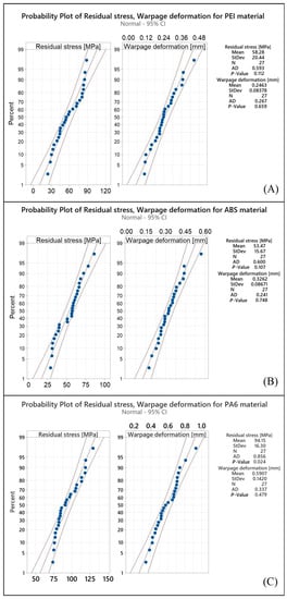 Probability plot of residual stress and warpage deformation for: (A) PEI, (B) ABS, and (C) PA6 materials.