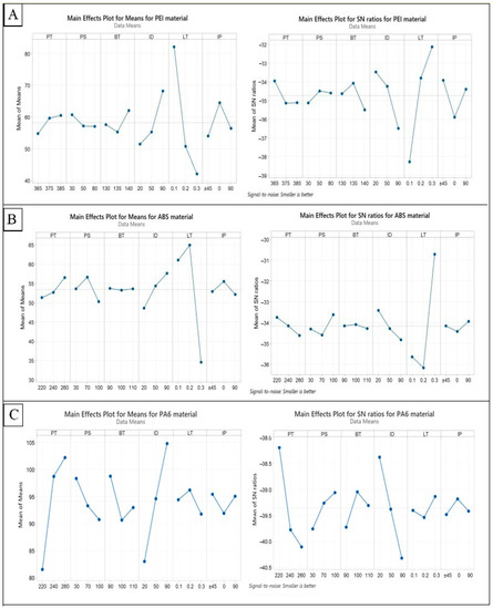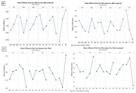Main effect plot of means and S/N ratios for warpage deformation: (A) PEI, (B) ABS, and (C) PA6.