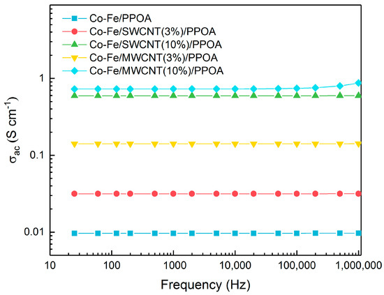 The dependence of electrical conductivity on the frequency of the Co-Fe/SWCNT/PPOA and Co-Fe/MWCNT/PPOA nanocomposites compared to Co-Fe/PPOA was studied (Figure 11).