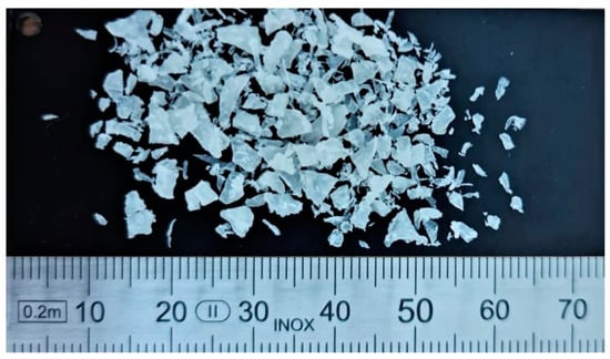 Both biopolymers, before plasticization, were dried at 60 °C in a vacuum oven for 24 h. As shown in Table 2, plasticized systems with TEC weight concentrations of 10%, 20%, and 30% were mixed using a two-roll mill LRM-S-110/3E from Lab Tech Engineering Company Ltd. Mixing time was 3 min and the roll temperatures were 165 °C and 175 °C. Furthermore, the plasticized systems were milled at room temperature and 700 rpm using a Retsch cutting mill SM300 with a 6 mm sieve. The obtained flakes (see Figure 1) with average dimensions of 3 mm × 2 mm were used for manufacturing test specimens using compression molding. Test specimens for mechanical property tests were cut from ~0.5 mm thick plates with dimensions of 60 mm × 100 mm obtained by hot pressing at 190 °C. Samples for oscillatory shear rheology tests were cut from 1 mm thick plates with dimensions of 60 mm × 100 mm, similarly obtained by hot pressing.