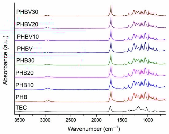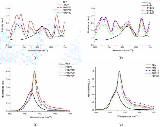 FTIR-ATR spectroscopy was used to assess the structural changes in the plasticized systems after the introduction of TEC. The collected FTIR spectra are shown in Figure 2. In Table 4, representative absorption bands of PHB, PHBV, and TEC are summarized. There is no great difference between the FTIR spectra of PHB and PHBV due to a small amount of HV units in PHBV (1 mol%). The addition of TEC also did not change FTIR spectra dramatically due to structural similarities between the plasticizer and the polymer. The appearance of no new peaks in the FTIR spectra of the plasticized systems also confirms no chemical interaction between TEC and PHB or PHBV. The greatest changes after the addition of TEC have been observed in the carbonyl absorption region; while for TEC, this peak is shifted to the direction of longer wavelengths in comparison to those of PHB and PHBV. However, several bands attributed to C–O–C groups’ asymmetric stretching (1180 cm−1 and 1181 cm−1 for PHB and PHBV, respectively), C–O–C groups’ symmetric stretching (1130 cm−1 and 1129 cm−1 for PHB and PHBV, respectively), C-O groups’ vibrations (1226 cm−1 and 1274 cm−1), and also –C=O groups’ vibrations have been previously related to the ratio of amorphous and crystalline parts of PHAs []. Therefore, the main attention was devoted to the assessment of the changes in the crystalline structure of PHB and PHBV after plasticization with TEC. In the current case, respective bands are not significantly shifted due to the addition of TEC. However, the intensity of the bands at 1181 cm−1, 1129 cm−1, 1226 cm−1, and 1274 cm−1 of PHBV decreased to a greater extent in comparison to that of the TEC plasticized PHB (see Figure 3). This may be indicative of a larger influence of TEC in the crystalline structure of PHBV in comparison to that of PHB, resulting in more effective plasticization of the copolymer along with addition of TEC.