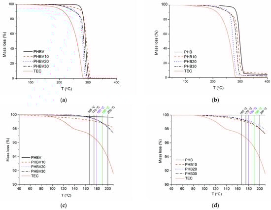 TGA thermograms of TEC plasticized PHBV and PHB systems within the full temperature range (a,b, respectively) and within the temperature range of 40 °C and 200 °C (c,d, respectively).