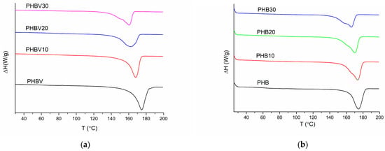 First heating DSC thermograms of the plasticized systems based on PHBV (a) and PHB (b).