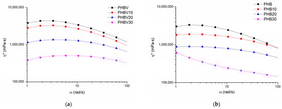 Complex viscosity (η*) versus angular velocity (ω) plots for PHBV (a), PHB (b), and their plasticized systems (190 °C).