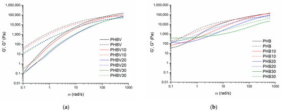 Storage (G″) and loss (G′) modules versus angular velocity (ω) plots for the plasticized systems based on PHBV (a), and PHB (b) (190 °C).