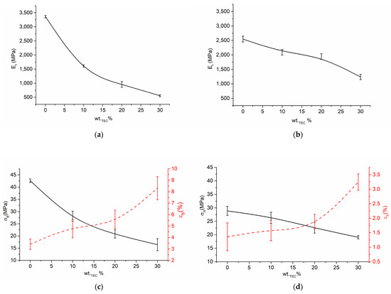 As seen in Figure 8a,b, by increasing the TEC content up to 30 wt.%, the modulus of elasticity E of the plasticized systems experiences a nearly twofold decrease from 2546 MPa to 1236 MPa and from 3559 MPa to 712 MPa for PHB- and PHBV-based systems, respectively. This indicates that the addition of structurally bulky TEC considerably affects the rigidity of the polymer matrix, especially in the case of PHBV. Consequently, although E of neat PHBV, mainly due to its higher molecular weight, is ca 1.3 times higher than that of neat PHB, after plasticization with 30 wt.% of TEC E of PHBV-based system becomes 2.2 times lower than that of its PHB-based counterpart. Similarly, the addition of TEC has also led to a considerable decrement of stress at break σB of all the plasticized systems, especially in the case PHBV-based systems. Thus, due to plasticization with 30 wt.% of TEC σB of PHBV- and PHB-based systems decrease by 60% and 40%, respectively. This suggests that PHBV is more efficiently plasticized by TEC in comparison to PHB. Hence, plasticized PHBV-based systems demonstrate 2.5 times larger ultimate elongation values in comparison to PHB-based systems. Disregarding this, ultimate deformation ɛB of PHB and PHBV due to plasticization increases to a similar extent, i.e., approximately 2.5 times at the maximum TEC concentration.