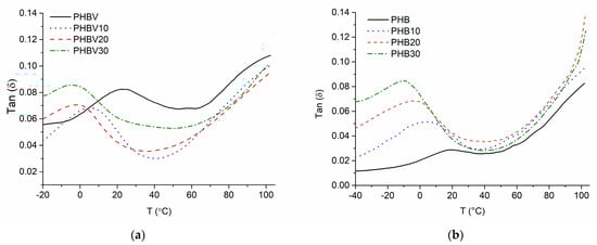 Loss factor tan δ and storage modulus E′ versus temperature T relationships of the investigated plasticized systems are shown in Figure 9 and Figure 10. The tanδ(T) relationships demonstrate well-expressed relaxation region within temperature intervals −10 °C–+55 °C with maxima at 22 °C for PHBV and between −10 °C and +40 °C with maxima at 19 °C for PHB. This relaxation is associated with glass transition in the amorphous phases of PHB or PHBV. The breadth of this relaxation region is associated with the presence of crystalline fraction in both polymers as previously stated by Scandola et al. []. As shown in Table 9, the addition of TEC causes a considerable negative shift in glass transition maxima by 26 °C for both PHBV plasticized with 30 wt.% of TEC and its PHB-based counterpart. This is because the plasticizer causes the weakening of intermolecular forces that contribute to the stiffness of the material.