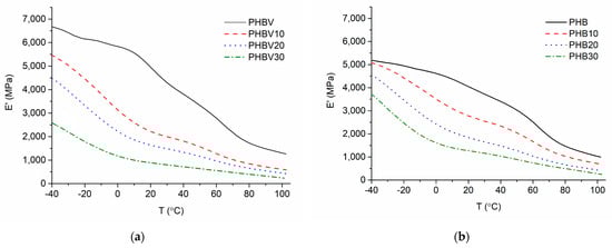 E′(T) relationships of the plasticized systems based on PHBV (a), and PHB (b).