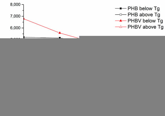 Apart from the Tg peak, another well-expressed intensity is observed in the tanδ(T) relationships with onset at ca 63 °C and ca 45 °C for PHBV and PHB, respectively. This intensity may be related to the beginning of the crystal–crystal slippage occurring in semicrystalline polymers just below melting as stated by Madbouly et al. [] and McDonald et al. [] who observed high-temperature relaxation of PHB at about 110 °C. This transition may also be related to the α′ relaxation of the amorphous–crystalline interphase []. The addition of TEC promoted this relaxation process to occur at somewhat lower temperatures, especially in the case of PHBV-based systems, confirming that TEC affects the structure of PHBV to a greater extent in comparison to PHB.