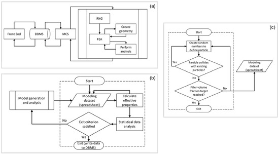 In the present work, the SFEA framework described in [19] was adopted to study the mechanical properties of the particulate composite material. In the following, only a synopsis of the SFEA method is provided, and the interested reader is referred to the aforementioned technical literature for further details. The SFEA framework involves a Monte Carlo simulation (MCS) technique to compute results using statistical analysis and different program modules involving multiple programming languages. The SFEA algorithm is shown in Figure 1.
