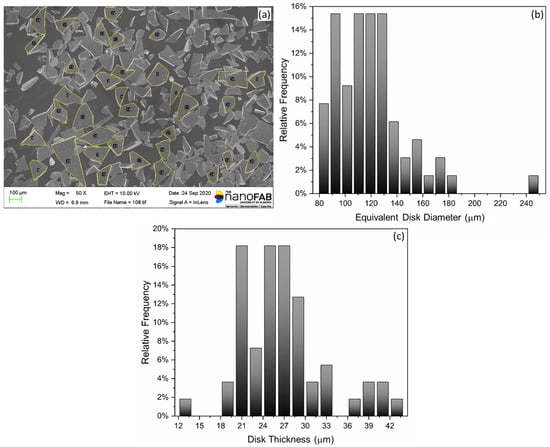 Reduced data from SEM imaging magnetic particle morphology: (a) SEM image of magnetic particles, (b) histogram of equivalent disk diameters, and (c) histogram of disk thickness.