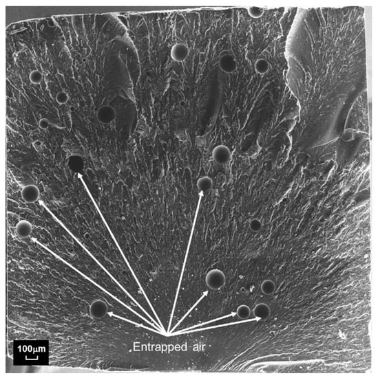 Stitched SEM image showing entrapped air voids in fractured L-2wt% specimen.