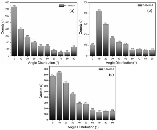 Particle alignment distribution for three samples: (a) P-12vol%-4, (b) P-12vol%-7, and (c) P-12vol%-9.