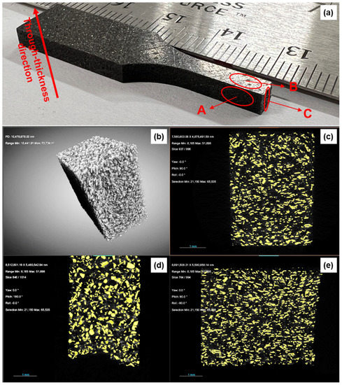 Example images of X-ray microscopy. The photograph of the test sample (a) explains the orthogonal cross-section views (c–e), with (b) showing complete sample devoid matrix phase.