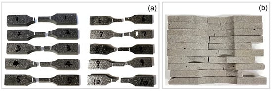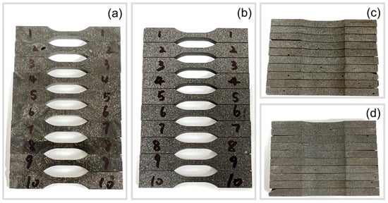 Figure 8 shows ten dogbone-shaped samples that were waterjet cut from a fabricated composite disk. While some isolated larger air voids were present in the samples (see Figure 8c,d), the quality of the specimens was deemed sufficiently consistent and suitable for the experiments.