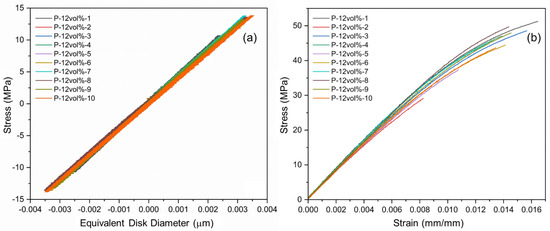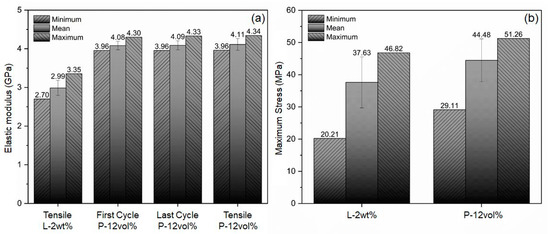 The stress–strain data from cyclic and tensile testing are depicted in the graphs in Figure 10a,b, respectively. Practically no hysteresis effects were observed during the tension/compression cyclic tests, see Figure 10a, indicating that specimen responses were fully elastic, and no appreciable damage accumulated within the selected load range. The slopes of the different stress–strain curves were similar, yet some variation can be observed, which may be the result of slight morphological differences, such as differences in filler alignment and entrapment of air voids. Since material responses were practically linear in the cyclic tests, elastic moduli were computed for the first and last load cycle as the slope of a linear section between the extremes of the applied loading range of ±100 N. As shown in Figure 11a, the calculated average modulus of elasticity for the various composite specimens was 4.08 GPa and 4.09 GPa for the first and last load cycle, with standard deviations of 0.110 GPa and 0.117 GPa, respectively.