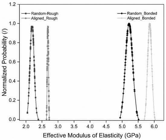 Numerical results for the effective elastic modulus from the SFEA are depicted in Figure 13 in terms of normalized probability. It can be noticed that for each modeling case, i.e., the fully random distribution and randomly aligned distribution with the “rough contact” and “bonded contact” options, the modulus data appear to fall under a normal distribution. Table 5 summarized the kurtosis and skewness for the four modeling cases. These values confirm that all modeling data for the elastic modulus are indeed normally distributed [19]. As one may expect, the effective moduli for the randomly aligned distribution cases are greater than for the fully random distribution cases, owing to a greater stiffening effect when the particles are aligned in the loading direction. The difference in interface properties between the rough contact and bonded contact option is shown to have a significant effect on the predicted moduli, i.e., the ability of particles to separate from the matrix in the rough contact cases has a strongly diminishing effect on material stiffness.