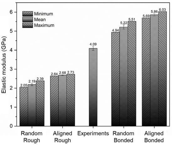 where EAR, EAB, ERR and ERB and EE are the effective moduli from the modeling cases “aligned rough” (2.68 GPa), “aligned bonded” (5.86 GPa), “random rough” (2.19 GPa) and “random bonded” (5.22 GPa), and the average elastic modulus from experiments (4.09 GPa), respectively (see Figure 14). Simplifying Equation (1), it is found that α = 0.484. Based on this expression, the modulus for a composite with fully aligned filler particles (χ = 1) and with fully random particles (χ = 0) would be correspondingly 4.32 GPa and 3.75 GPa.