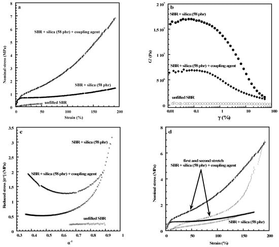 It is of interest to mention that silica-filled PDMS systems display a strong interface created by hydrogen bonding between the silanols and the oxygen atoms of the PDMS chains. A tailored treatment of this interface can be used to optimize the properties of the resulting composite. In the case of poor compatibility between the elastomer chains and the filler surface as in the case of silica-filled hydrocarbon rubbers, coupling agents such as the bis(3 triethoxysilylpropyl) tetrasulfide (TESPT), commonly abbreviated “Si69”, can be used to help the filler dispersion and to improve the adhesion between the organic and inorganic phases. This molecule bears ethoxy groups that can interact with silica and a tetrasulfane function that can react with the hydrocarbon rubber. Figure 2a shows that a large increase in stiffness is obtained when the SBR (styrene–butadiene rubber) is filled with silica compounded with a coupling agent. In the absence of a coupling agent, filler networking dominates at low strains reflected by the strong increase in the initial modulus (Figure 2a), the strong amplitude of the Payne effect (Figure 2b) and the strong decrease in the reduced stress at small deformations (Figure 2c). Figure 2d shows that the Mullins effect is less important without the coupling agent, thus pointing out the role played by polymer–filler interactions and the interface between the two phases in the stress-softening phenomenon. A study carried out on SBR/silica composites by Bernal-Ortega et al. [22] shows that the way of modifying the silica surface strongly affects the properties of the resulting material. The use of pre-modified silica appears as an alternative to the in situ silanization of silica during the mixing process.