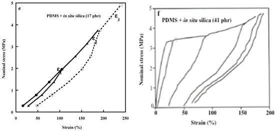 The mechanical behavior of in situ filled systems, different from that of conventional composites, is typical of interpenetrated double networks observed in hydrogel systems and double network elastomers based on a toughening strategy consisting of a covalently cross-linked brittle first network and a stretchable second network [38,39,40]. The interpenetration of two networks of different properties imparts to the resulting material specific features such as yielding and large hysteresis due to the fracture of covalent bonds in the first network. The silica-filled PDMS display a small amount of stress-softening before the formation of the filler network, which may be related to the good filler dispersion and the narrow distribution of chain lengths between filler particles. But significant residual deformation (Figure 3e,f) that becomes much more important above the percolation threshold is observed as the result of the breaking up of both the filler network and the polymer-filler bonds (Figure 3f). It is interesting to mention that no Payne effect is observed in the silica-filled systems even after the formation of the filler network, which probably means that the silica network is resistant to the mechanical work applied within the strain range investigated (Figure 3b). A Payne effect is observed for the titania-filled PDMS networks which is consistent with the tensile results (Figure 3a,c).