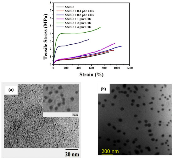 Stress–strain curves of neat carboxylated acrylonitrile butadiene latex (XNBR) and XNBR latex filled with different carbon dots (CDs) contents. (a) TEM image of pristine CDs; (b) TEM image of XNBR + 2 phr CDs. Source: Reprinted with permission from Ref. [51].