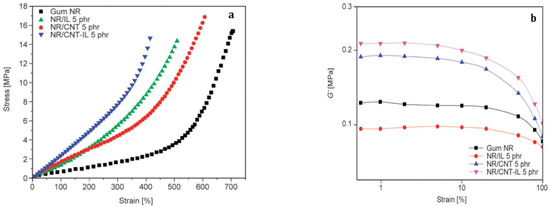 Unfilled natural rubber network (NR) and NR composites filled with carbon nanotubes in the absence (NR/CNT) or presence of a ionic liquid (NR/CNT-IL): stress–strain measurements (a); Payne effect (b). Source: Reprinted with permission from Ref. [76].