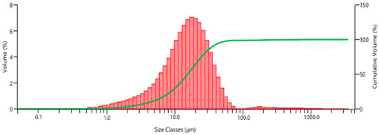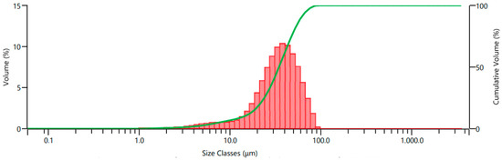 Ti6Al4V powder obtained from the milling process was subjected to 325 and 625 mesh sieve analysis, and particle size classification was performed. Two types of recycled Ti6Al4V powder obtained after sieve analysis were coded as A and B according to their particle size distribution. The commercial Ti6Al4V powder was coded as C. The particle size distributions of the recycled powders, are dispersed by a range of dry units, were determined using a laser diffraction particle size measurement instrument (Malvern Panalytical Mastersizer 3000, Malvern, UK). Two kinds of recycled Ti6Al4V powder fillers, coded as A and B, were utilized, with mean particle sizes of 15.4 μm and 34.6 μm, respectively. Particle size distribution histograms of powders A and B are given in Figure 1 and Figure 2, respectively. Commercial Ti6Al4V powder with a particle size of 15–45 μm was also used for comparison in the same parameters. The commercial Ti6Al4V powder was obtained from the Nanokar Company (Istanbul, Turkey).