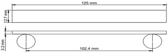 Five specimens of each type were tested. The results were averaged from five tests. The three-point bending test was performed with a constant loading speed of 1 mm/min at room temperature, and a span length of 102.4 mm, as per American Society for Testing and Materials (ASTM) D790, using a Shimadzu universal testing machine. The dimensions of the specimens were 125 mm × 12.7 mm × 3.2 mm with a span of 102.4 mm length, as given in Figure 4. A fixed span-to-depth ratio of 32 was used.