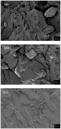 The flexural strength values of the PA10-PB10-PC10 composites were significantly enhanced compared with the unfilled polyester composite due to good particle dispersion and strong polymer/filler interface adhesion for effective stress transfer [26,27]. This implies that the particle proportion has a significant effect on composite strength. For the particulate composites, the flexural strength depends on the transfer of stress between the matrix and particles [28]. The greatest improvement in flexural strength was obtained at a 10 wt.% content of PB10. The lowest flexural strength of the composites was obtained with a 10% particle proportion in the PC10 composite.