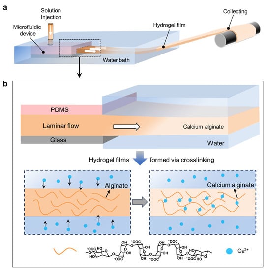 (a) Schematic of the continuous fabrication of thin CA hydrogel films with steps involving laminar flow generated in the microchannels, film-formation in the water bath, and collecting. (b) The crosslinking of alginate by Ca2+ ions to convert the laminar flow into the CA hydrogel film.