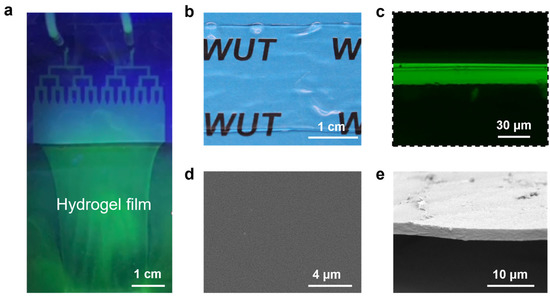 In this study, a reaction solution containing SA was used to demonstrate the applicability of our microfluidic-based laminar flow strategy. With appropriate flow rate, the solution from the syringe was injected into the microfluidic device and printed out as a laminar flow of the reaction solution into the coagulating bath (Figure 2a). Meanwhile, Ca2+ ions in the coagulating bath, which was previously dissolved with CaCl2, diffused into the laminar flow of the reaction solution (Figure 2b). Through electrostatic interaction, Ca2+ ions can replace the binding sites of Na+ ions in the chain segment; that is, Ca2+ ions and carboxyl groups in alginate form “egg-box” structures, leading to the sol-gel transformation of the reaction solution [59,60]. Thus, the laminar flow was immediately converted into the CA hydrogel film. This CA hydrogel film could be continuously printed by solution injecting through microfluidic devices and then be collected without the need of support substrates (Figure 3a and Video S1). This facilitates the formation of hydrogel film into a free-standing state, which is especially critical for maintaining the structural integrity of ultrathin samples (Figure 3b). The cross-sectional fluorescent image of the hydrogel (Figure 3c) indicated the film thickness of 19 μm. After the gel was dried, the clean cross-sectional and smooth surface morphology as revealed by the scanning electron microscope (SEM) image of a free-standing hydrogel film suggest a high homogeneity of the produced samples (Figure 3d,e).