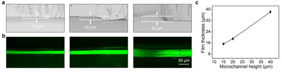 Control over the thickness of the CA hydrogel films. (a) Optical images of microfluidic devices with different microchannel heights. (b) Cross-sectional fluorescent image of the CA hydrogel prepared by microfluidic devices with different microchannel heights. (c) The correlation between the thickness of the produced CA hydrogel films and the microchannel heights.