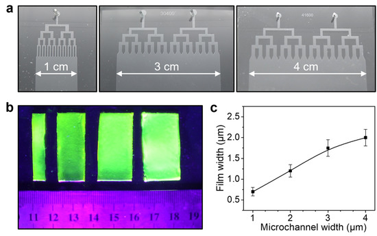 Control over the width of the ultrathin CA hydrogel films. (a) Optical images of microfluidic devices with different microchannel width. (b) Fluorescent image of the CA hydrogel films prepared by microfluidic devices with different microchannel width. (c) The correlation between the width of the produced CA hydrogel films and the microchannel width.