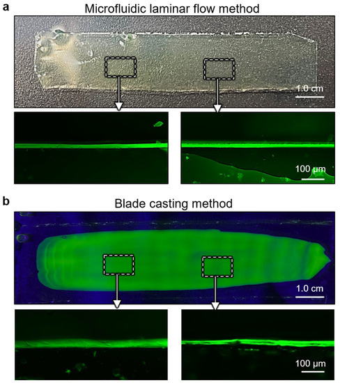 Microfluidic technology can be used to precisely manipulate laminar flow in microscale channels, providing an effective method for the continuous and scalable fabrication of ultrathin hydrogel films. Until now, several kinds of hydrogel films have been prepared by using appropriate film forming methods. For example, Callahan’s team prepared heterogeneous hydrogel films with bioactivity gradients in microfluidic channels by controlling the flow rate of hydrogel prepolymers and using UV-induced polymerization [40] Heterogeneous polyethylene glycol dimethacrylate and polyethylene glycol-based hydrogel films were prepared with concentration gradients of multiple peptides, and cells were introduced into heterogeneous hydrogels, which could be used for cell culture and tissue engineering [41,42]. In addition to photopolymerization, polymer films can also be obtained through films formation methods such as ion crosslinking and non-solvent induced phase separation (NIPS) [43]. For example, Gao’s group developed a wet- spinning method to continuously fabricate bioinspired graphene oxide (GO) hydrogel films by ionic crosslinking [44]. These works demonstrated the feasibility of the development of polymer films based on microfluidics laminar flow. However, this area is still in its infant stage, and many issues need to be addressed. For example, how to precisely control the thickness of polymer films, especially free-standing hydrogel films, is still challenging.
