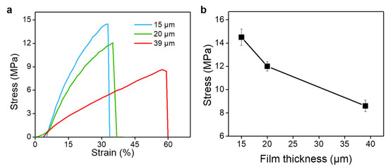 The mechanical properties of the ultrathin CA hydrogel films prepared by the microfluidic laminar flow method were evaluated. Figure 7a shows the typical stress–strain curves of the ultrathin CA hydrogel films with a series of thickness. The tensile strength of the CA hydrogel films increases when their thickness decreases from 39 μm (8.6 ± 0.5 MPa) to 15 μm (14.5 ± 0.7 MPa) (Figure 7b). We speculated that this result might be attributed to the insufficient crosslinking for the thicker hydrogel films. In this work, the ionic crosslinking time for preparing CA hydrogel is about 20 s, which is much lower than the reported crosslinking time (several minutes) in the literature [61,62]. By increasing the crosslinking time from 20 s to 20 min, the tensile strength of the CA hydrogel film with thickness of 39 μm increased 8.6 ± 0.5 MPa to 14.7 ± 0.7 MPa, which was similar with the one with thickness of 15 μm (Figure S1). Due to the prolonged immersion time, Ca2+ ions can effectively diffuse into the thick hydrogel films, leading to enough crosslinking and increased mechanical properties. These results demonstrate that the mechanical properties can be regulated by controlling the crosslinking of the hydrogel films.