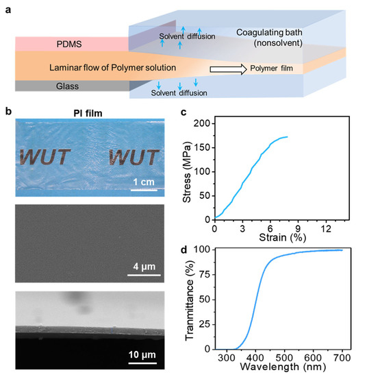 Fabrication of thin polymer films by microfluidic laminar flow method via the NIPS process. (a) Schematic of the fabrication of ultrathin polymer films by NIPS with steps involving extrusion of laminar solution flow through the microchannels of microfluidic device and the subsequent phase separation induced by solvent diffusing into the water bath. (b) Optical and SEM images of PI films prepared by microfluidic laminar flow method via the NIPS process. (c) Typical stress–strain curve and (d) transmittance of the PI film.