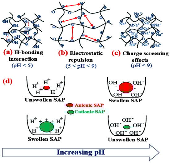 However, SAPs have the ability to respond to environmental stimuli such as variations in temperature, pH, solvent composition, enzymes, light, and electrical fluids. This means that SAPs can exhibit various behaviors or properties in response to these external factors. For instance, changes in temperature or pH can affect the swelling or absorption capacity of SAPs. In addition, variations in solvent composition may affect their solubility, while enzymes can catalyze specific reactions or degradation of the SAPs. Light exposure can trigger photo-degradation or changes in their physical properties, whereas electrical fluids can influence their conductivity and electrical properties. All these characteristics make SAPs versatile and suitable for various applications where environmental responsiveness is desired [6,7].