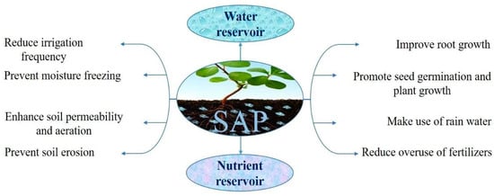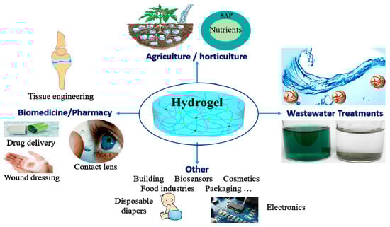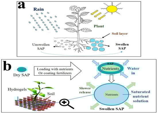 Based on Grant & Hackh’s Chemical Dictionary, superabsorbent polymer (SAP) is defined as a solid with a cross-linked three-dimensional network that swells and retains 20–95% of water due to its hydrophilic polymeric chains [1]. More precisely, superabsorbent polymers, or hydrogels, are three-dimensional hydrophilic homopolymer or copolymer networks obtained from natural and/or synthetic monomer or polymer materials, which have the potential to absorb, thanks to their cross-linked macromolecular chains, considerable quantities of water [2] or biological fluid [3], without dissolution due to their physically and/or chemically cross-linked structures [4,5].