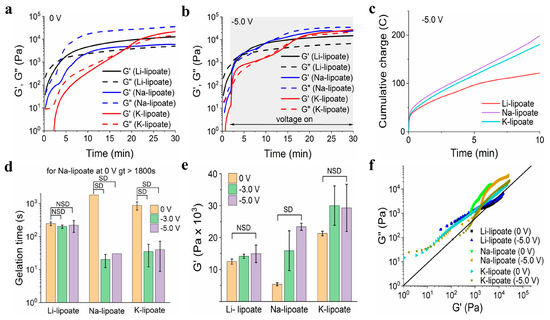 Gelation time and complex modulus were further evaluated under the influence of a cathodic electric field (Figure 2a and Figure S13) [35]. Sheared lipoates were subjected to an electric field of −3.0 V and −5.0 V and compared to 0 V (control). The negative magnitude indicated cathodic reduction at the working electrode (largest). If the redox hypothesis described above applies, the gelation time should be significantly shorter and correlate with the voltage value. No gas evolution was observed during cathode activation, suggesting other lower voltage processes were not occurring. Water electrolysis occurred at −1.2 V with gas evolution. Under ambient conditions, all three metal lipoate formulations underwent polymerization, attributed to the disulfide ring opening, as shown in Figure 1. However, for Li-lipoate (4M), gelation occurred within 4.1 ± 0.5 min and for K-lipoate at 14.6 min (±4.0 min). Na-lipoate did not display enough polymerization to reach gelation within 30 min, but storage and loss modulus continued to escalate (Figure 3a). Cross-linking kinetics of Na- and K-lipoates were accelerated by the application of voltage, with gelation times of 30 s (±0 s at −5.0 V) and 40 s (±31 s at −5.0 V), respectively, after cathodic activation (Figure 3b,d). Voltage-stimulated curing of the Li-lipoate formulation showed no increase of storage modulus (0 V vs. −5.0 V has NSD, p < 0.05) (Figure 3e), even though 1H NMR displayed an acceleration of monomer consumption under voltage; 5.5% @ 0 V vs. 12.7% @ −5.0 V after 10 min (Figure S8). Na-lipoate showed a significant increase in storage modulus (0 V vs. −5.0 V, p < 0.05), which is summarized in Figure 3e. Complex modulus (G*) comparisons with and without voltage displayed a clearer comparison of how voltage accelerates curing with little to no improvement in modulus after 25 min (Figure S5a–d).