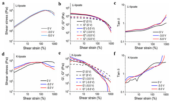 (a) Li-lipoate shear strain vs. shear stress at different voltages (0 V, −3.0 V, and −5.0 V). (b) Li-lipoate shear strain vs. modulus (G′ and G″) at different voltages (0 V, −3.0 V, and −5.0 V). (c) Li-lipoate shear strain vs. Tan d (G′ and G″) at different voltages (0 V, −3.0V, and −5.0 V). (d) K-lipoate shear strain vs. shear stress at different voltages (0 V, −3.0 V, and −5.0 V). (e) K-lipoate shear strain vs. modulus at different voltages (0 V, −3.0 V, and −5.0 V). (f) K-lipoate shear strain vs. Tan d (G′ and G″) at different voltages (0 V, −3.0 V, and −5.0 V).