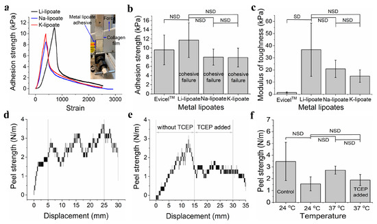 (a) A representative graph for the lap shear adhesion strength test of three metal lipoates (4M formulation) after 30 min curing at room temperature (0 V). (b) Comparison of lap shear adhesion strength of the three metal lipoates (4M formulation) after 30 min curing at room temperature (0 V); data presented as mean ± standard deviation, n = 3, p-values were calculated using a one-way ANOVA with Tukey test, NSD (no statistical difference) = p < 0.05. (c) Comparison of lap shear modulus of the toughness of the three metal lipoates (4M formulation) after 30 min curing at room temperature (0 V); data presented as mean ± standard deviation, n = 3, p-values were calculated using a one-way ANOVA with Tukey test, NSD (no statistical difference) = p < 0.05. (d) A representative graph for the peel adhesion strength of Li- lipoates (4M formulation) after 30 min curing at 37 °C temperature (0 V). (e) A representative graph for the peel adhesion strength test of Li- lipoates (4M formulation, 30 min curing at 37 °C) before and after adding TCEP solution (50 mM aqueous solution; 0 V). (f) Comparison of peel adhesion strength of Li-lipoates (4M formulation) for curing at 24 °C and 37 °C before and after adding TCEP solution (50 mM aqueous solution) (control = cellophane tape); data presented as mean ± standard deviation, n = 3, p-values were calculated using a one-way ANOVA with Tukey test, NSD (no statistical difference) = p < 0.05.