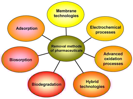 The global annual production of drugs has been estimated to be in the thousands of tons [2,6,21,22]. A wide range of methods (Figure 1), such as membrane separation, ozonation, flocculation, advanced oxidation, photocatalysis, microbial degradation, electrochemical processes, and adsorption, have been utilized to remove pharmaceuticals from aqueous matrices [3,7,8,23,24,25,26,27]. Most of these procedures involve the transfer of pollutants between different phases, the employment of additional chemicals, or the use of huge quantities of energy.