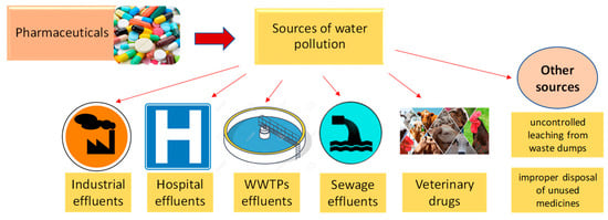 Pharmaceutical products and their transformation products can pollute surface water, underground water, and implicitly drinking water from a variety of sources (Figure 2), including wastewater treatment plant effluents, uncontrolled leaching from waste dumps, the pharmaceutical industry, hospitals, animal feed, improper disposal of unused medicines, etc. [2,6,21,22].