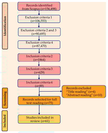 A total of 61 articles covering the removal of pharmaceuticals using microbial biomass and natural polymers were chosen for inclusion in the present review after applying the full set of exclusion/inclusion criteria, including title, abstract, and full-text reading (Figure 3). Additional work has been added to the selected items in order to provide the required context. These articles were retrieved manually by using a “search and find” strategy and certain keywords (such as “biosorption”, “pharmaceutical removal”, etc.) in the Scopus database. Studies revealing the removal of dyes and heavy metals on the one hand and other biomaterials that are not based on microbial biomass and natural polymers on the other hand were not taken into consideration for inclusion in the current study.