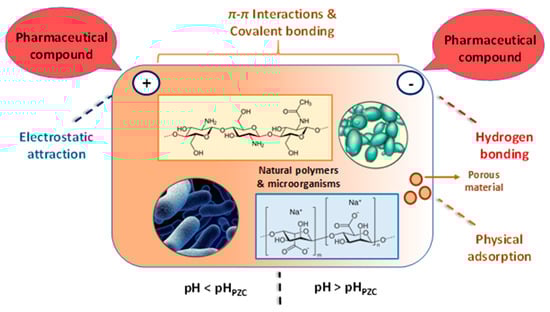 As shown in Figure 4, four dominant mechanisms can be taken into account in the biosorption of pharmaceutical compounds on biosobents based on natural polymers and microbial biomass (inactive cells): (i) electrostatic attraction between the bio-sorbent and drug; (ii) π–π interaction between the surface of biosorbents and the pharmaceutical compound; (iii) hydrogen bonding interaction; (iiii) physical adsorption in the pores of the biosorbent. The pH value of the pollutant solution plays an important role in the biosorption process. Thus, at pH < pHPZC, the electrostatic attraction is established between the negatively charged pharmaceutical compounds and the positive charge present on the surface of the biosorbent, and for pH values > pHPZC the surface of the biosorbent has a negative charge, and H bonds (hydrogen bonds) can be made between the pharmaceutical compounds and it.