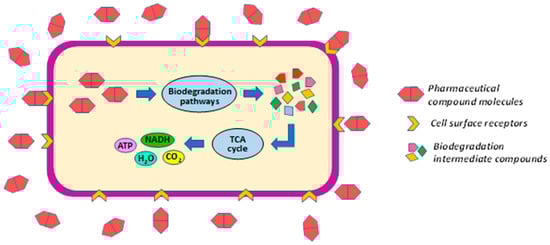In the case of biodegradation, a primary degradation (Figure 5) can take place in which the pollutant in question is used as an energy source and is directly metabolized by the microbial strain to obtain energy. This type of degradation process takes place inside the cell, and the pollutant must be able to travel through the microbial cell wall to the cytoplasm. However, in many cases, due to the complexity of metabolic activities, complete metabolism of the pollutant is not achieved, and hazardous biodegradation products may result.