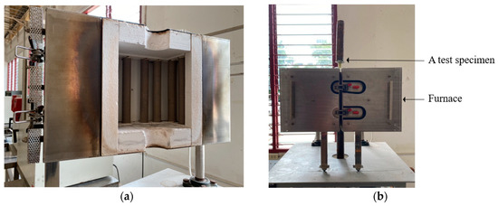 Prior to the experiment, a furnace, capable of heating to 1200 °C, was modified to dimensions of 200 mm, 200 mm, and 200 mm in width, depth, and height, respectively, as shown in Figure 2a to ensure heating occurred only in the desired area. By doing so, the high temperatures were unable to influence and harm the anchors, which played a crucial role during the tensile test as interfaces between the rebars and the loading head of the loading machine.